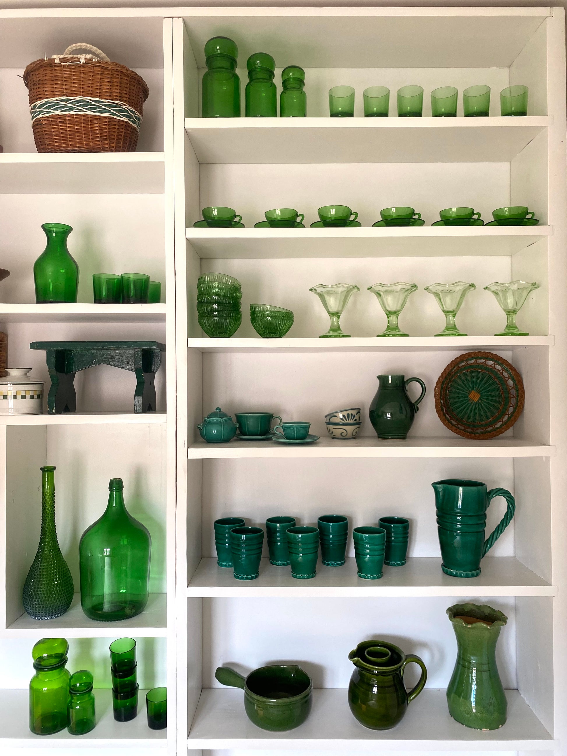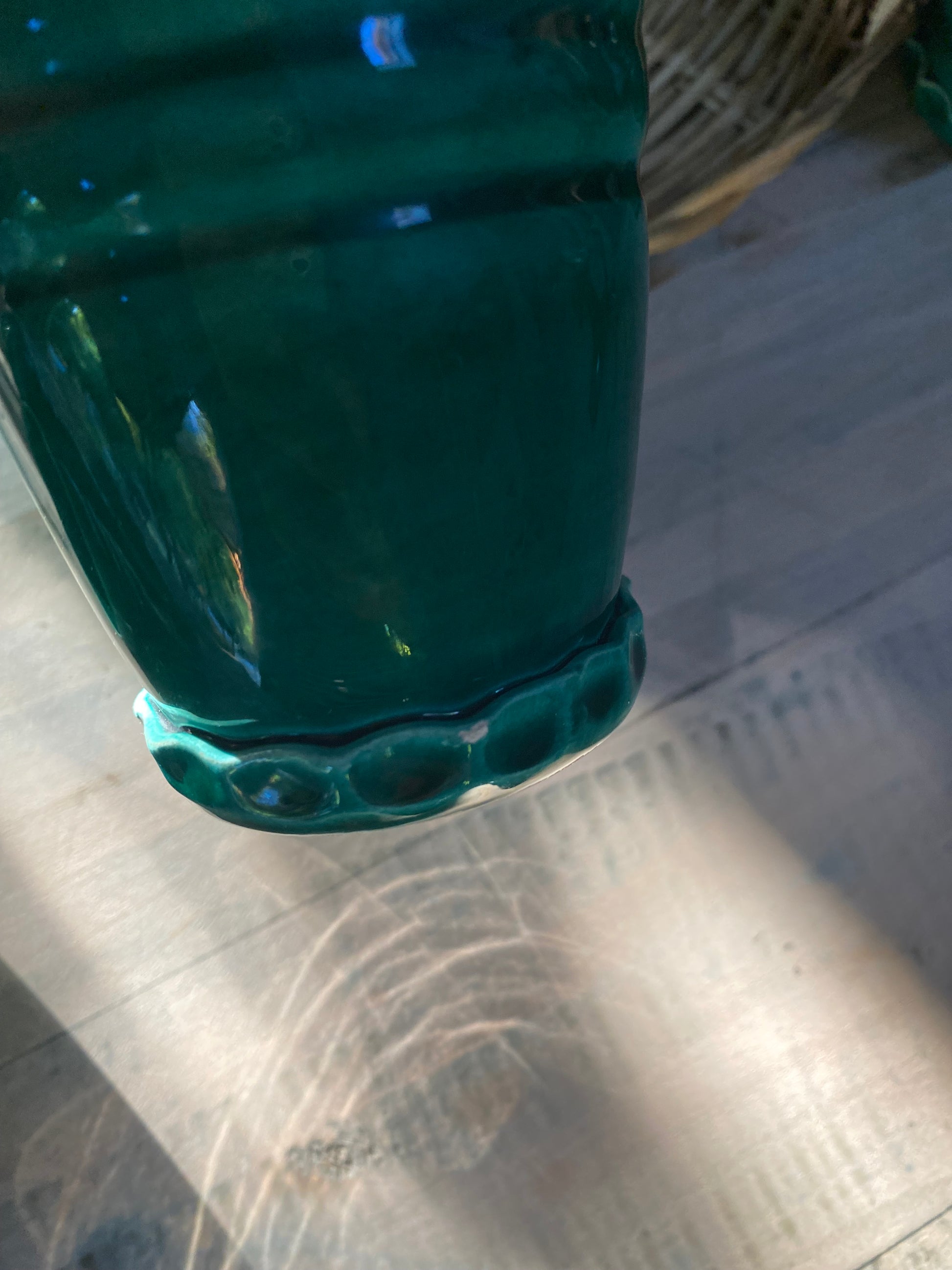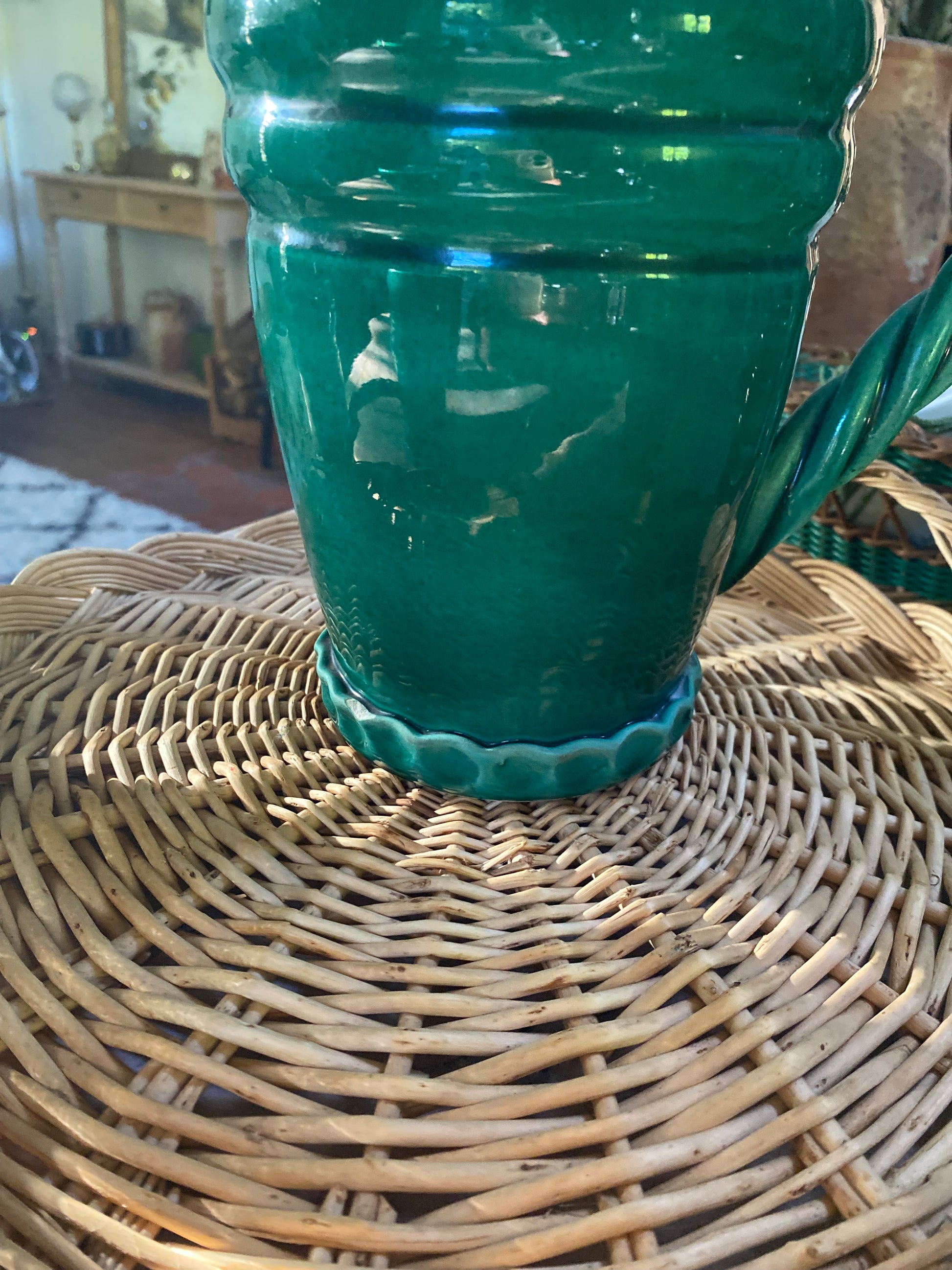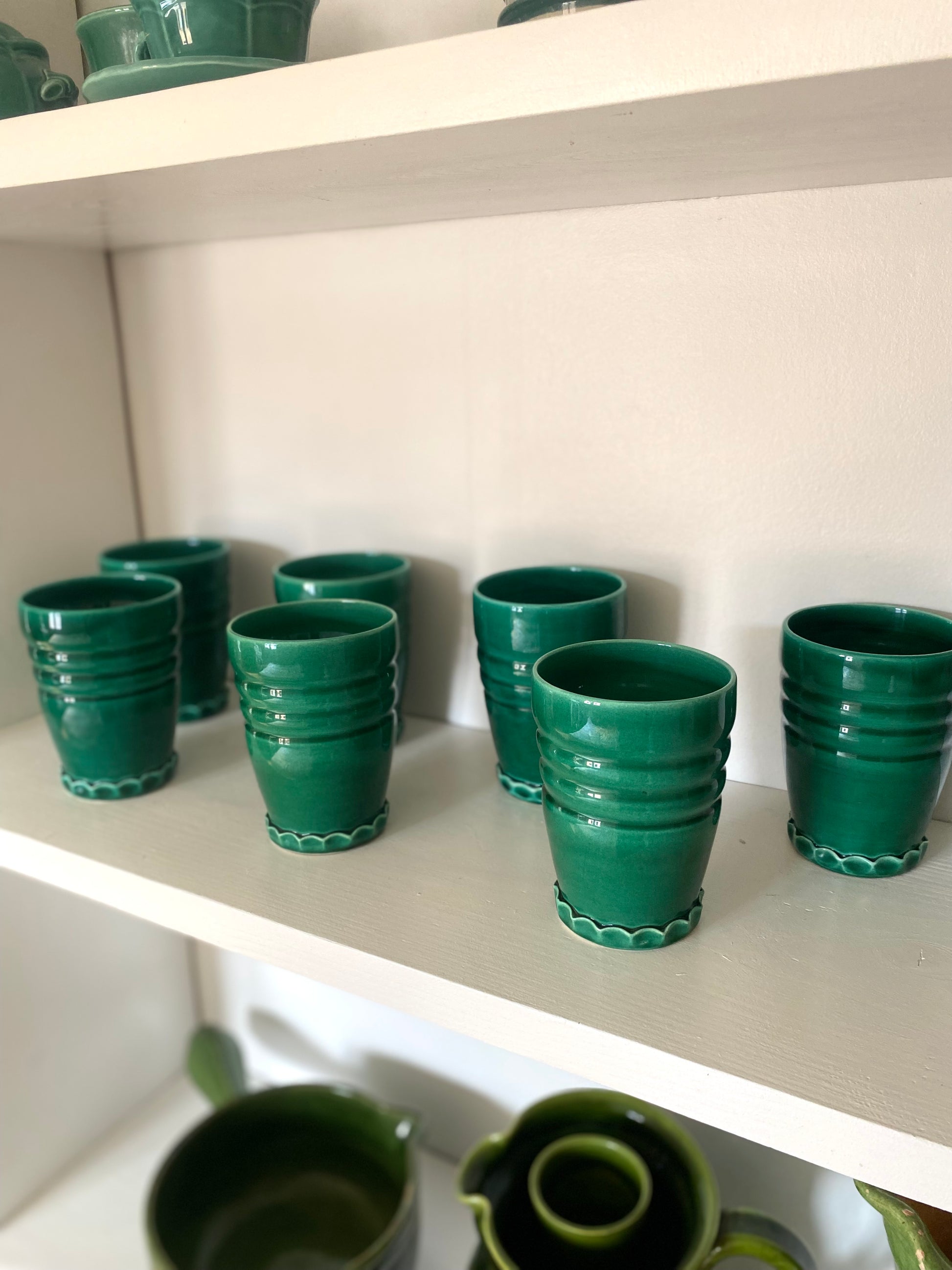 Magnifique service à orangeade en céramique de Vallauris dans un très beau vert profond composé d’un grand pichet et de 7 verres