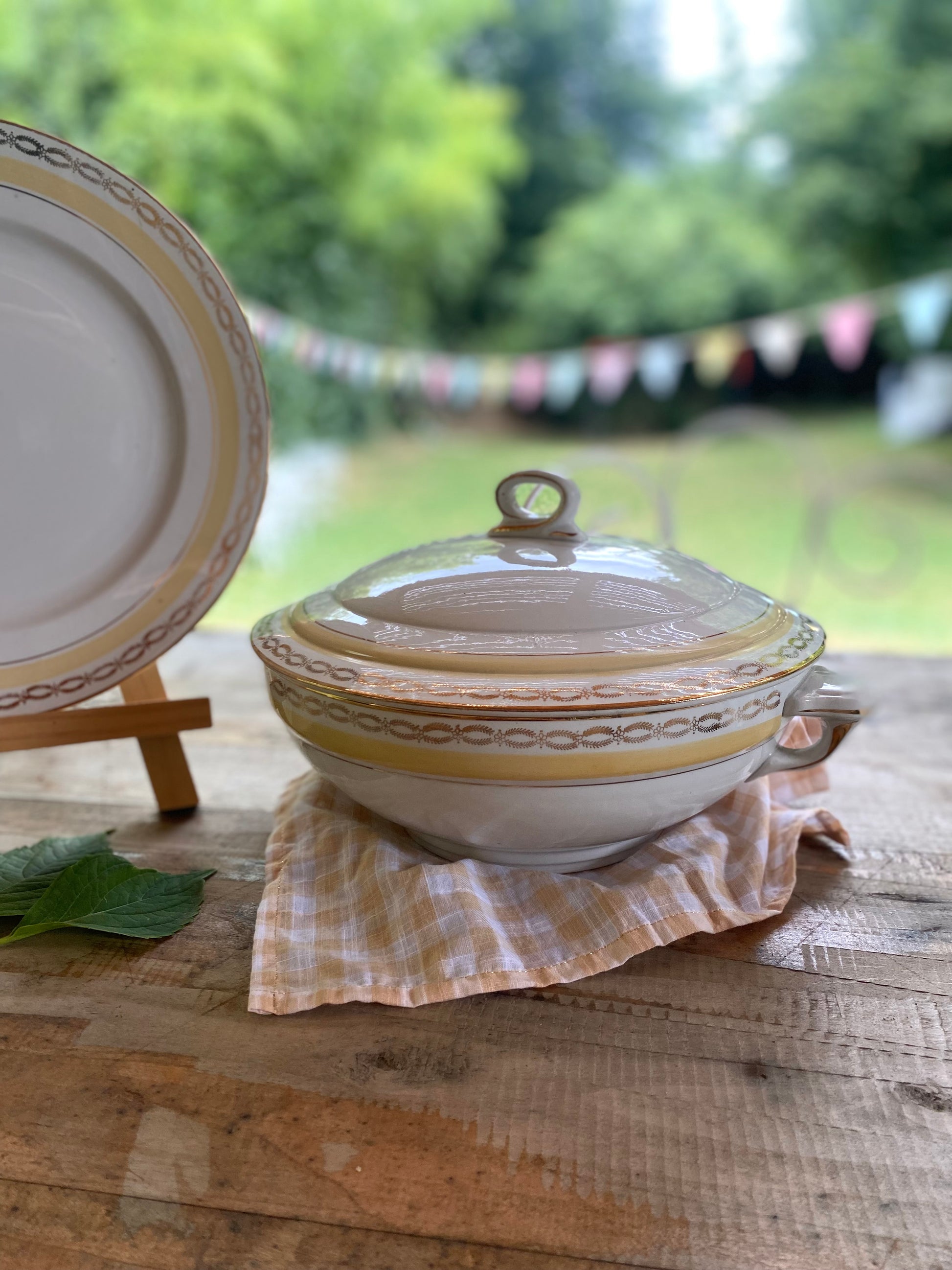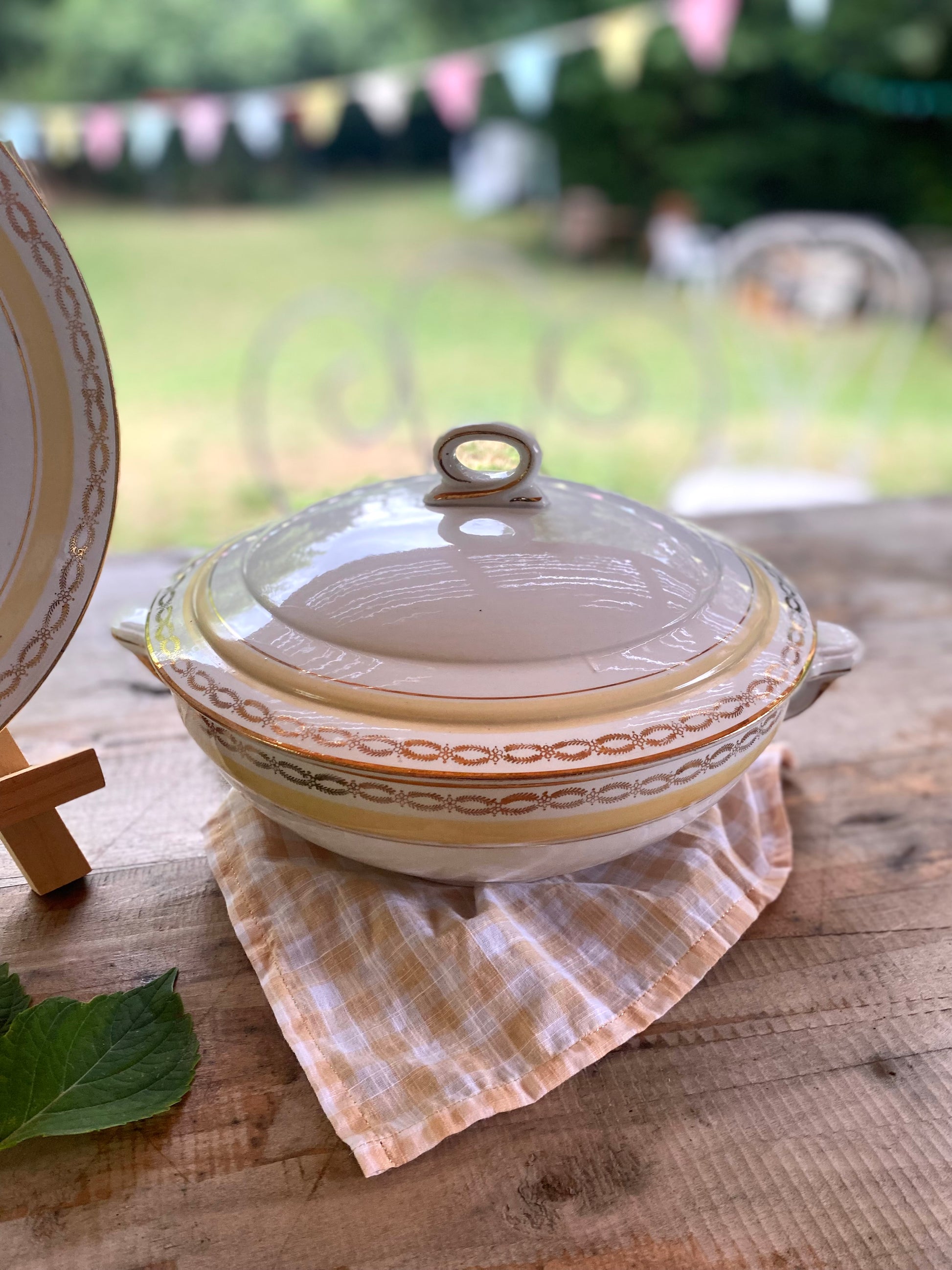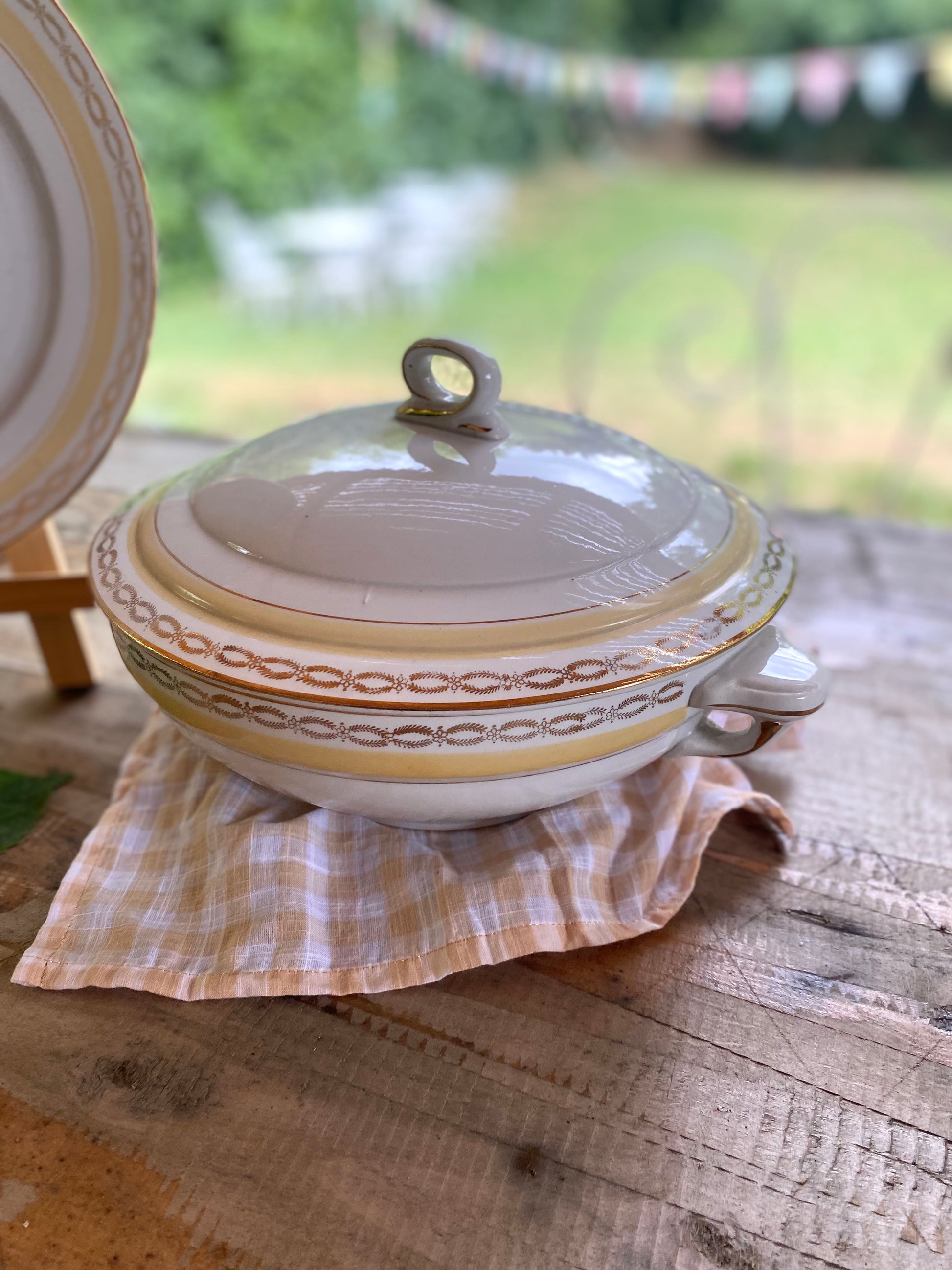 Ravissante soupière en faïence ancienne, très élégante avec son décor jaune pastel à liseré doré.
