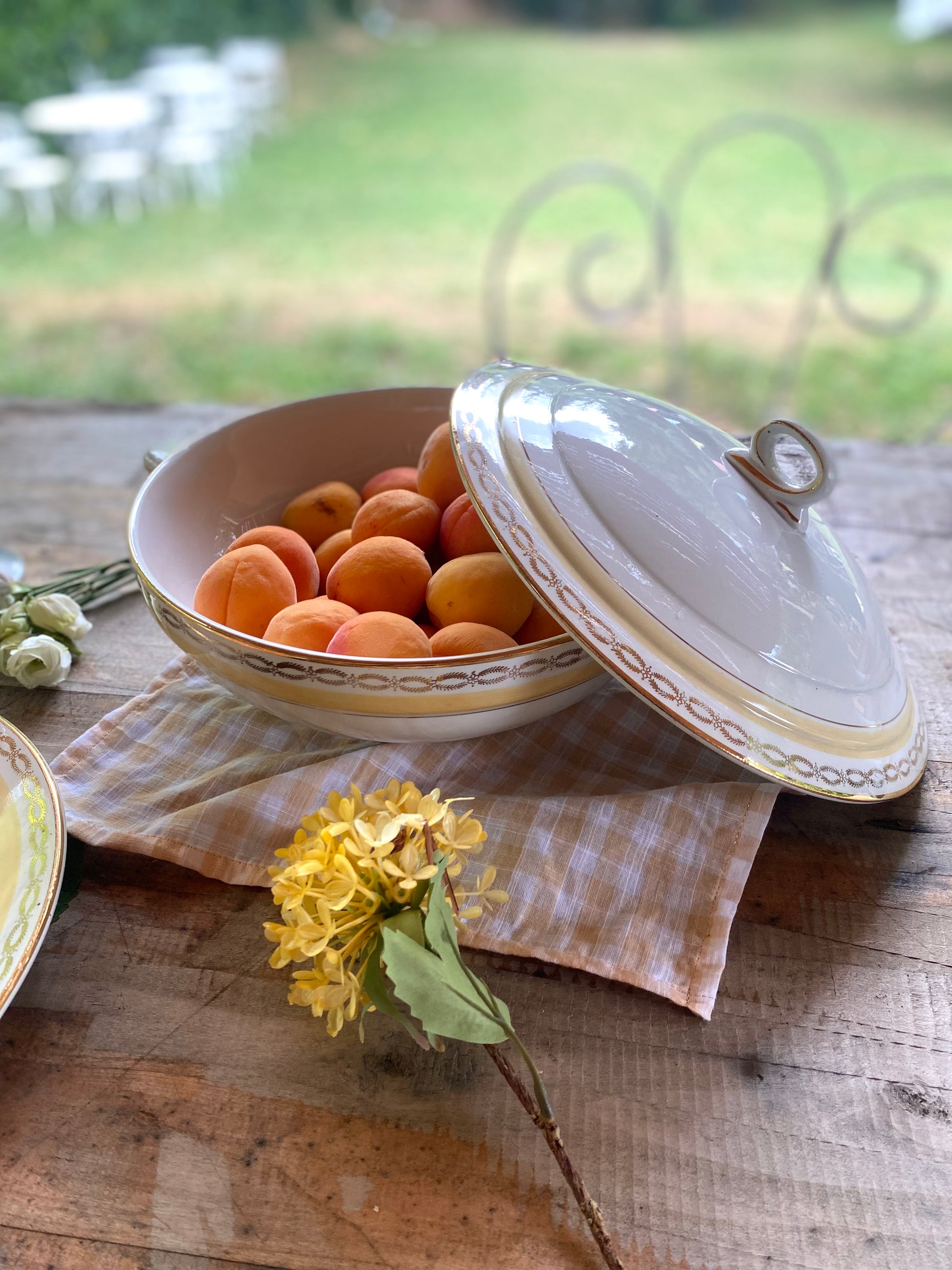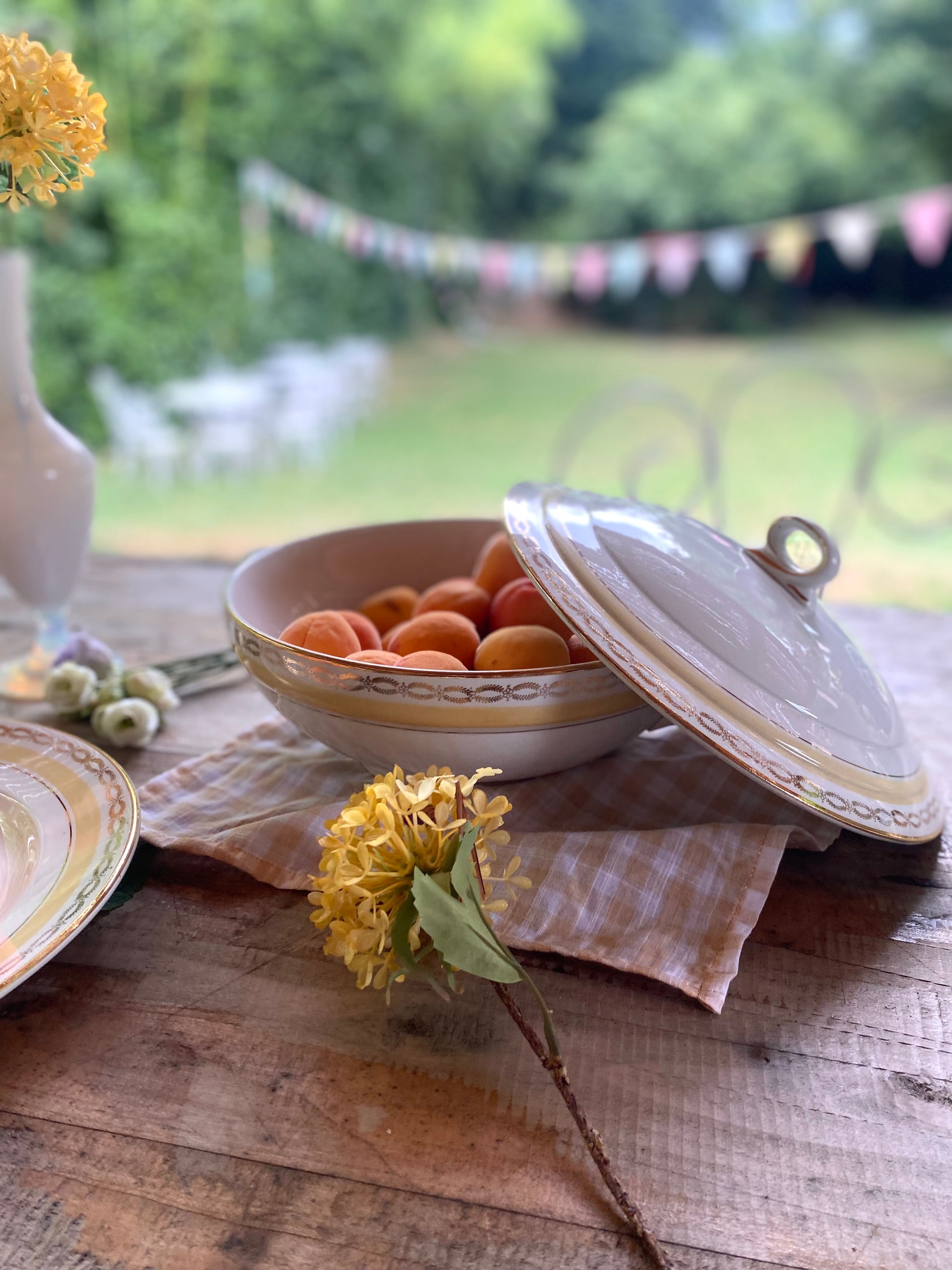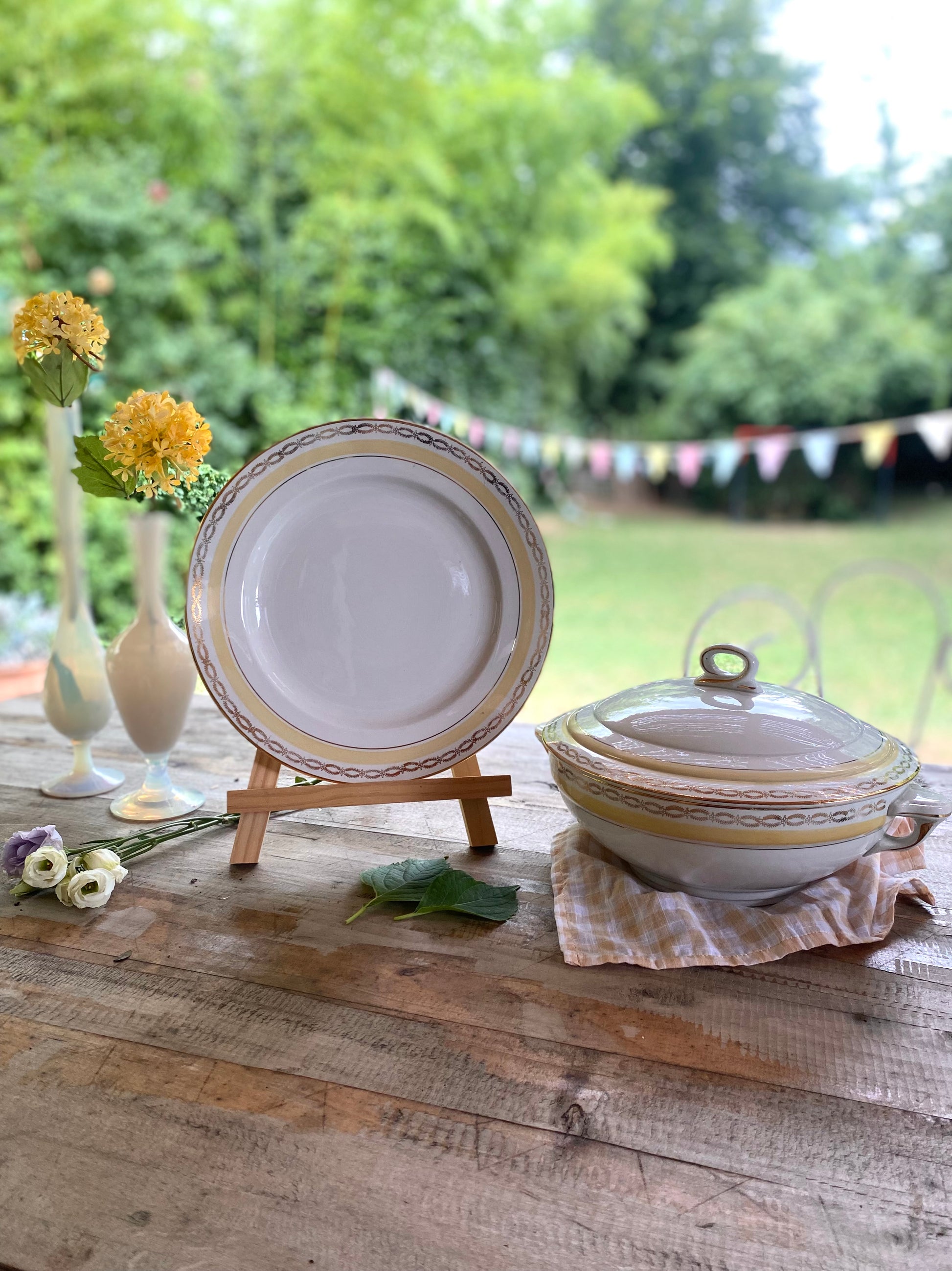Ravissante soupière en faïence ancienne, très élégante avec son décor jaune pastel à liseré doré.