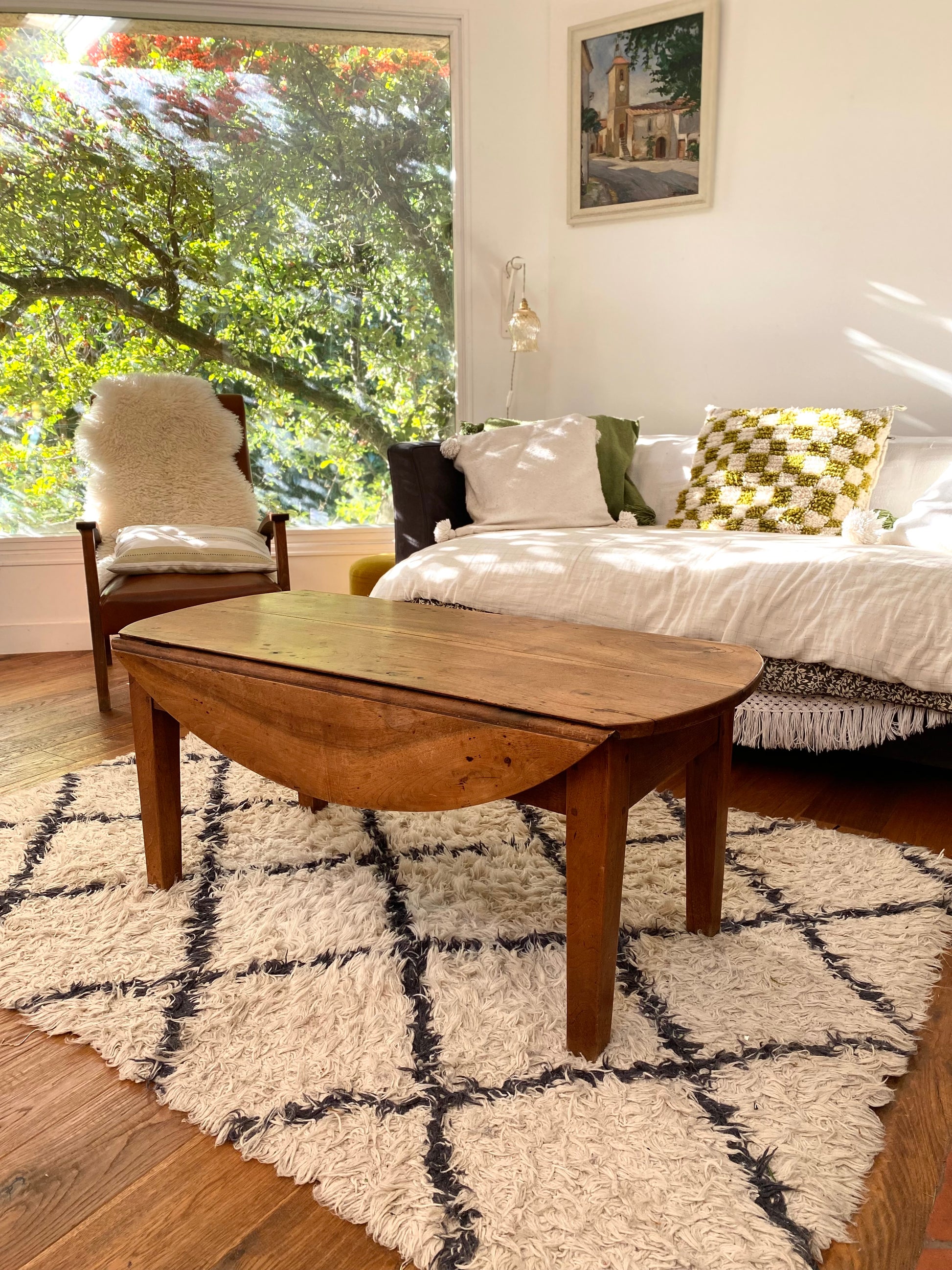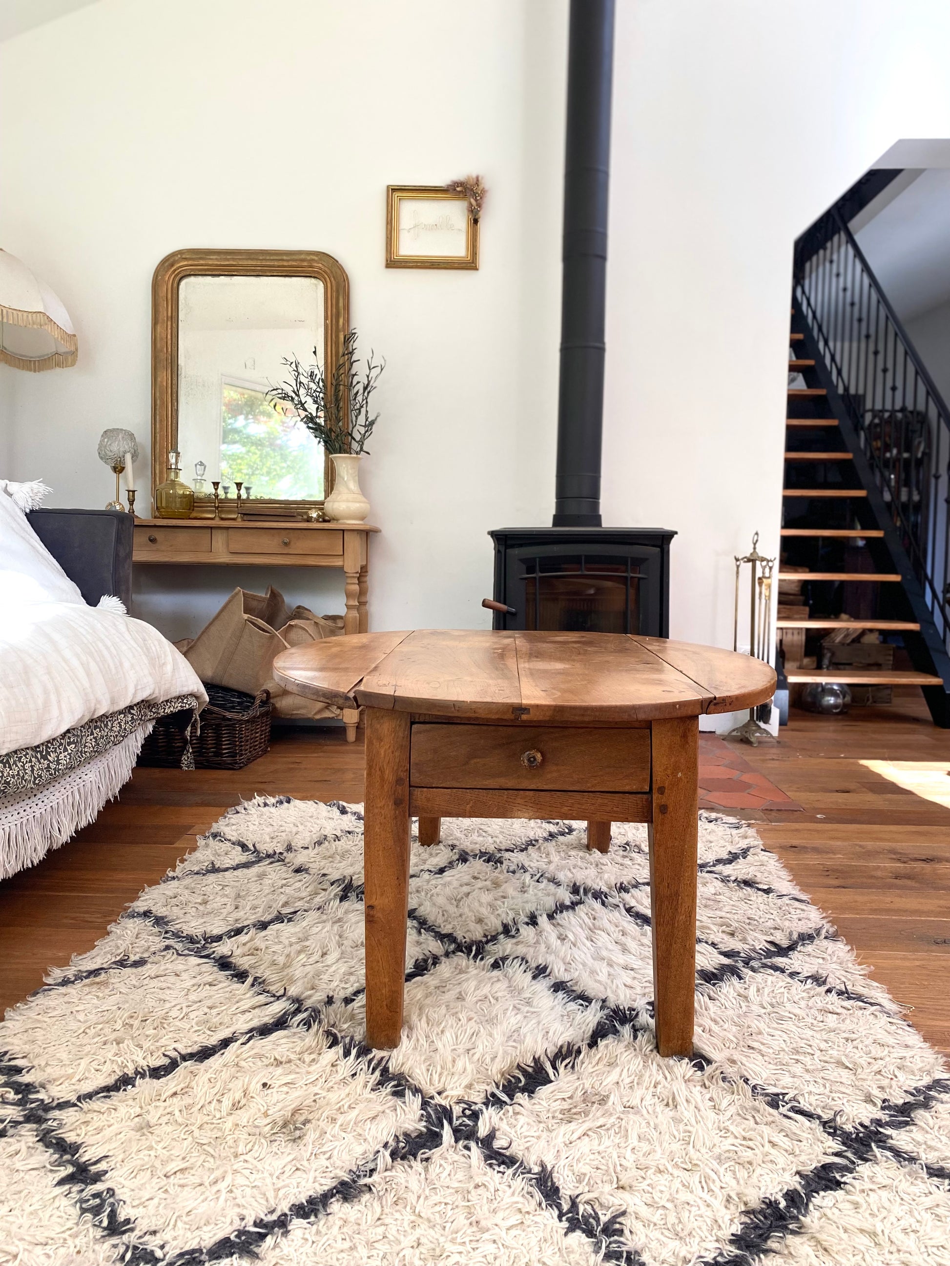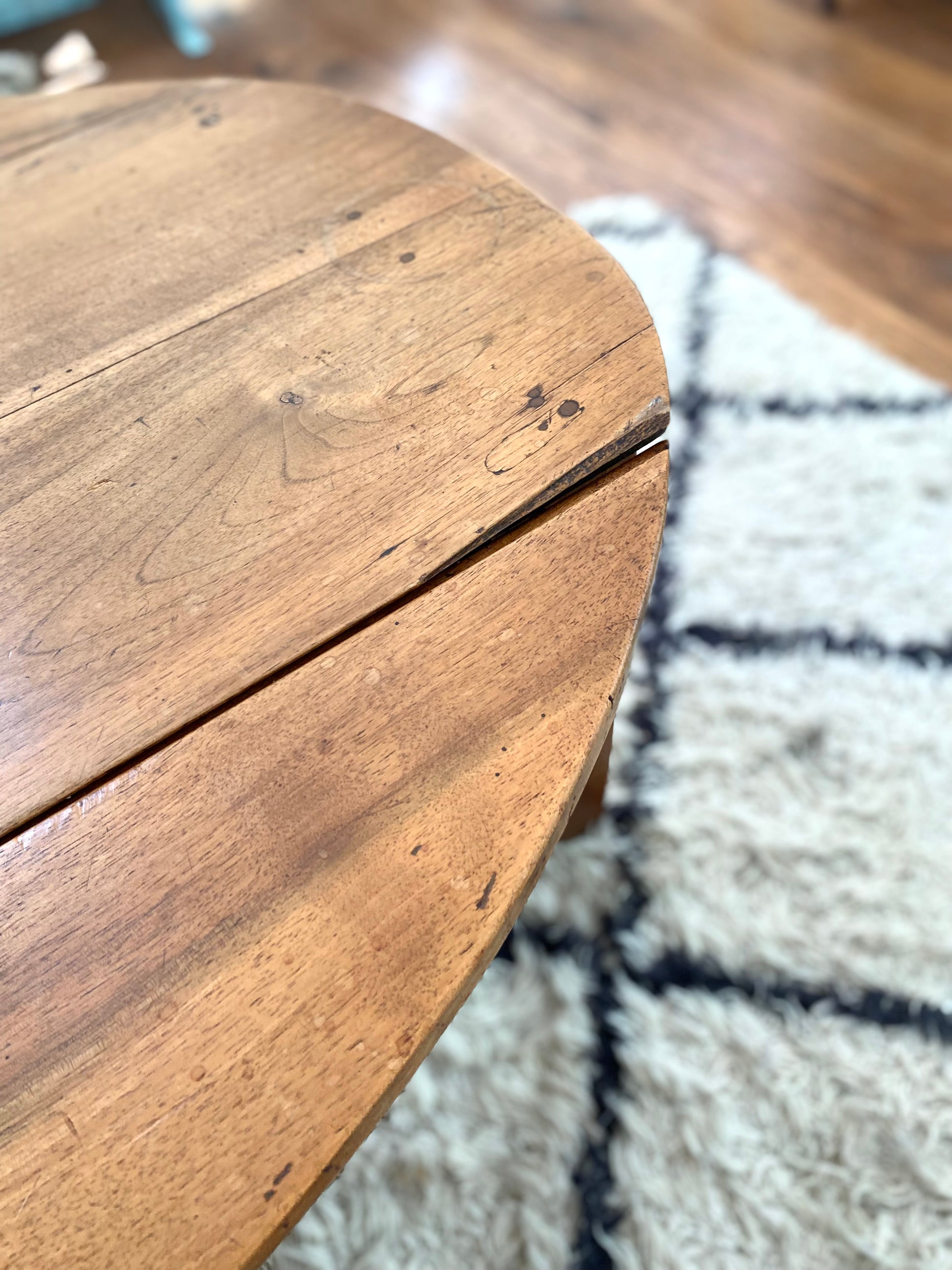 C'est une belle table basse ancienne en bois en bois massif ( noyer ) avec une patine vieillie qui lui donne beaucoup de caractère. La surface présente des signes d'usage (taches, petites marques, fissures naturelles) typiques d'un meuble ancien bien utilisé.