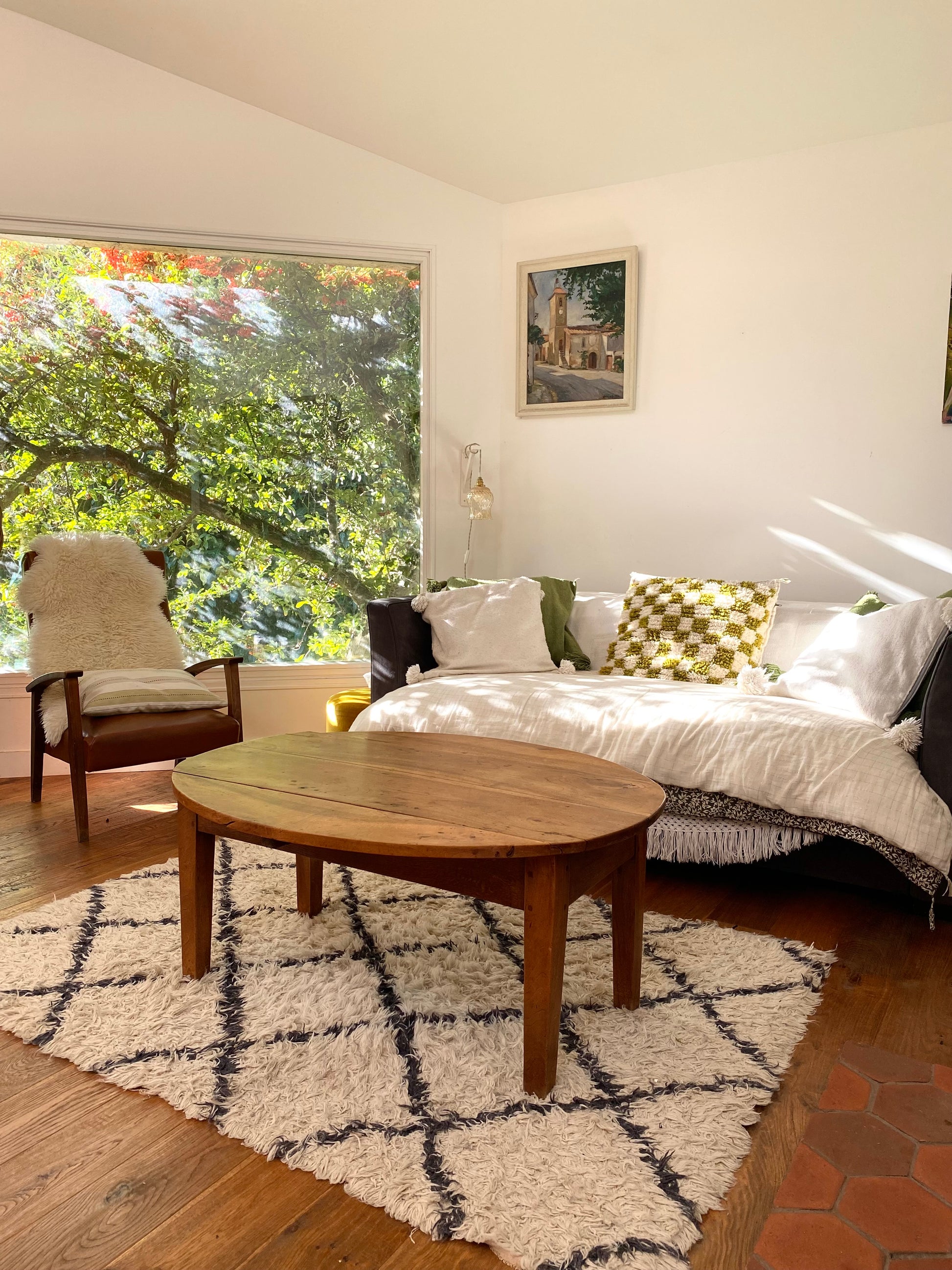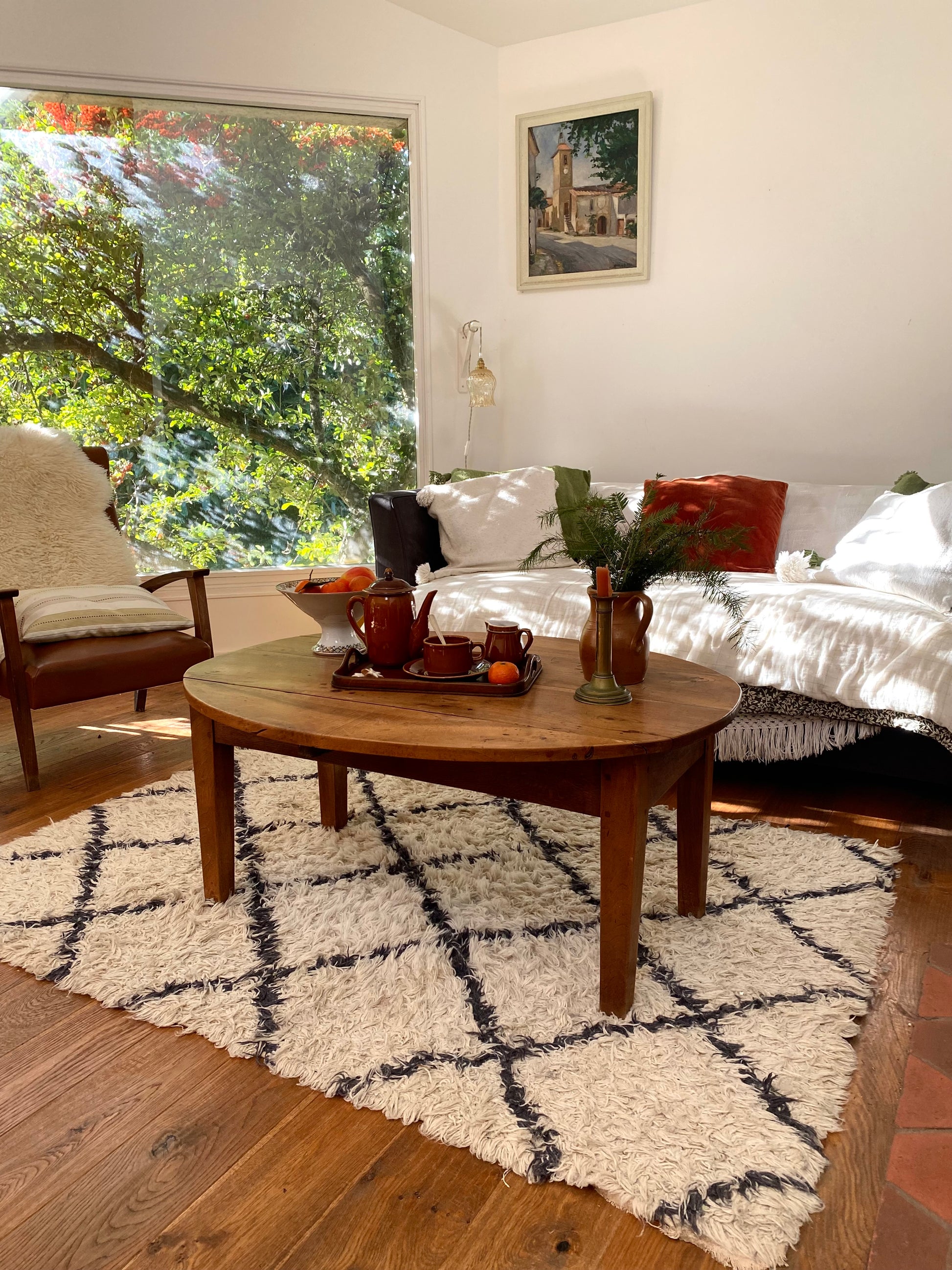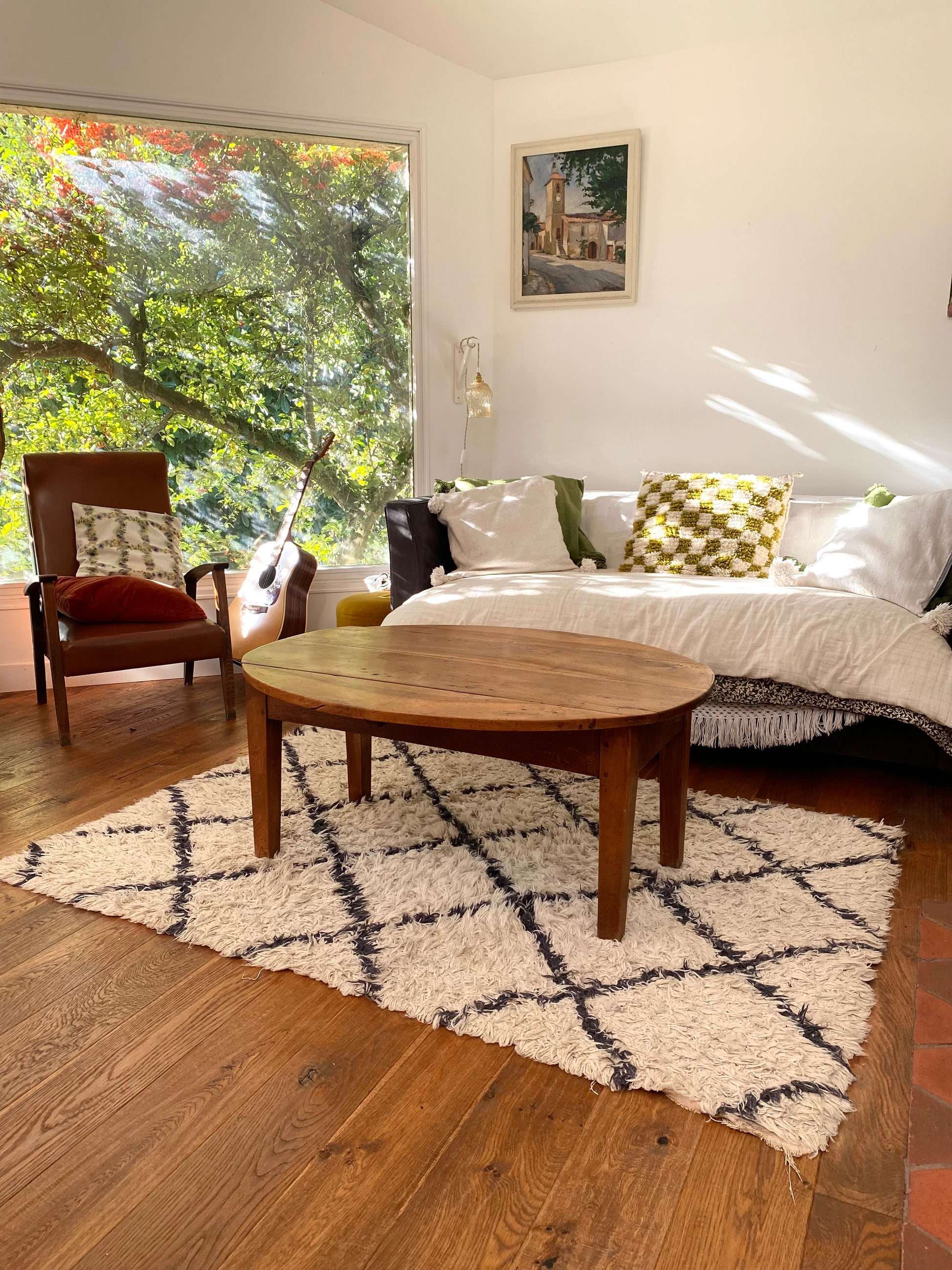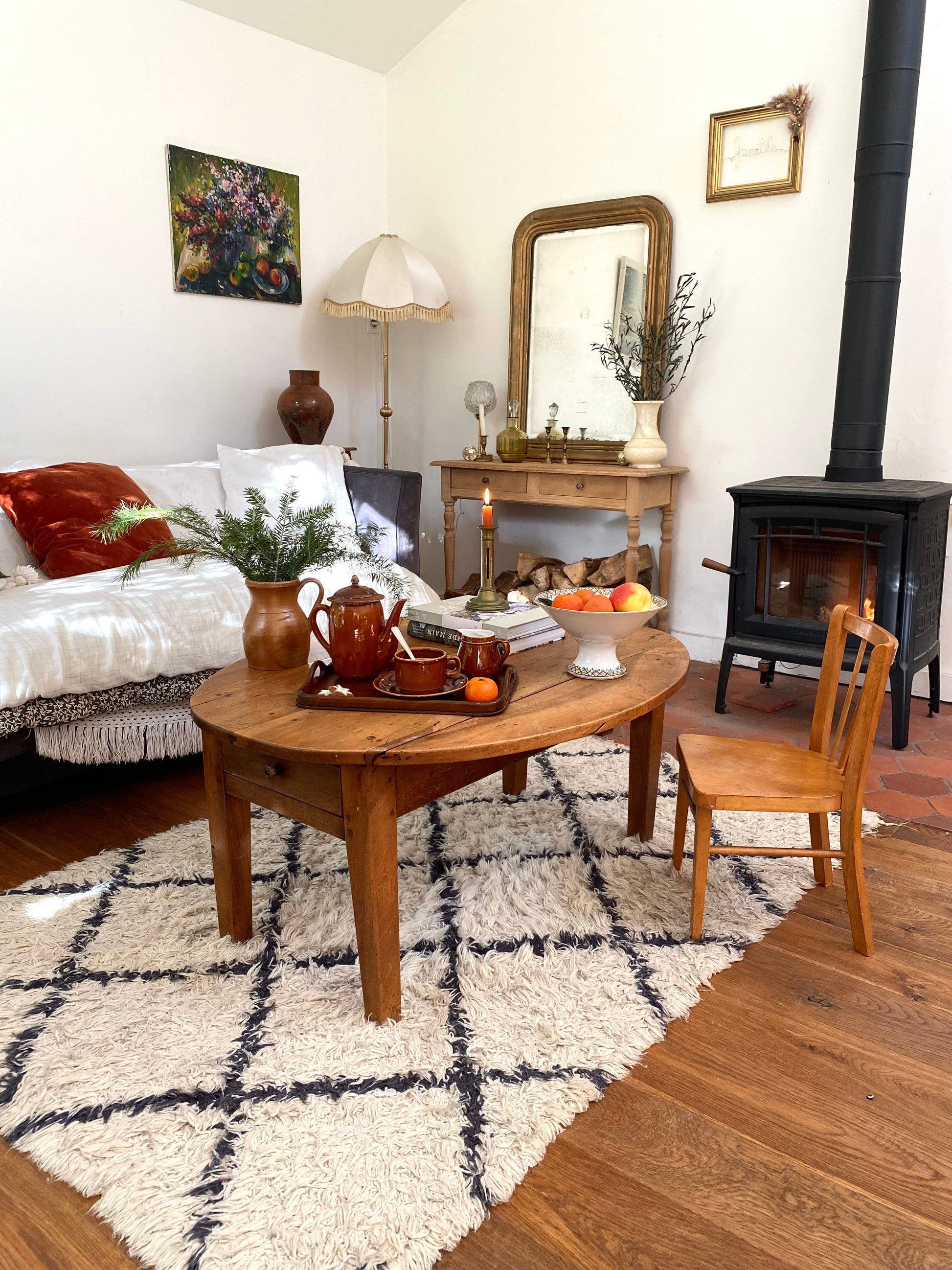 C'est une belle table basse ancienne en bois en bois massif ( noyer ) avec une patine vieillie qui lui donne beaucoup de caractère. La surface présente des signes d'usage (taches, petites marques, fissures naturelles) typiques d'un meuble ancien bien utilisé.