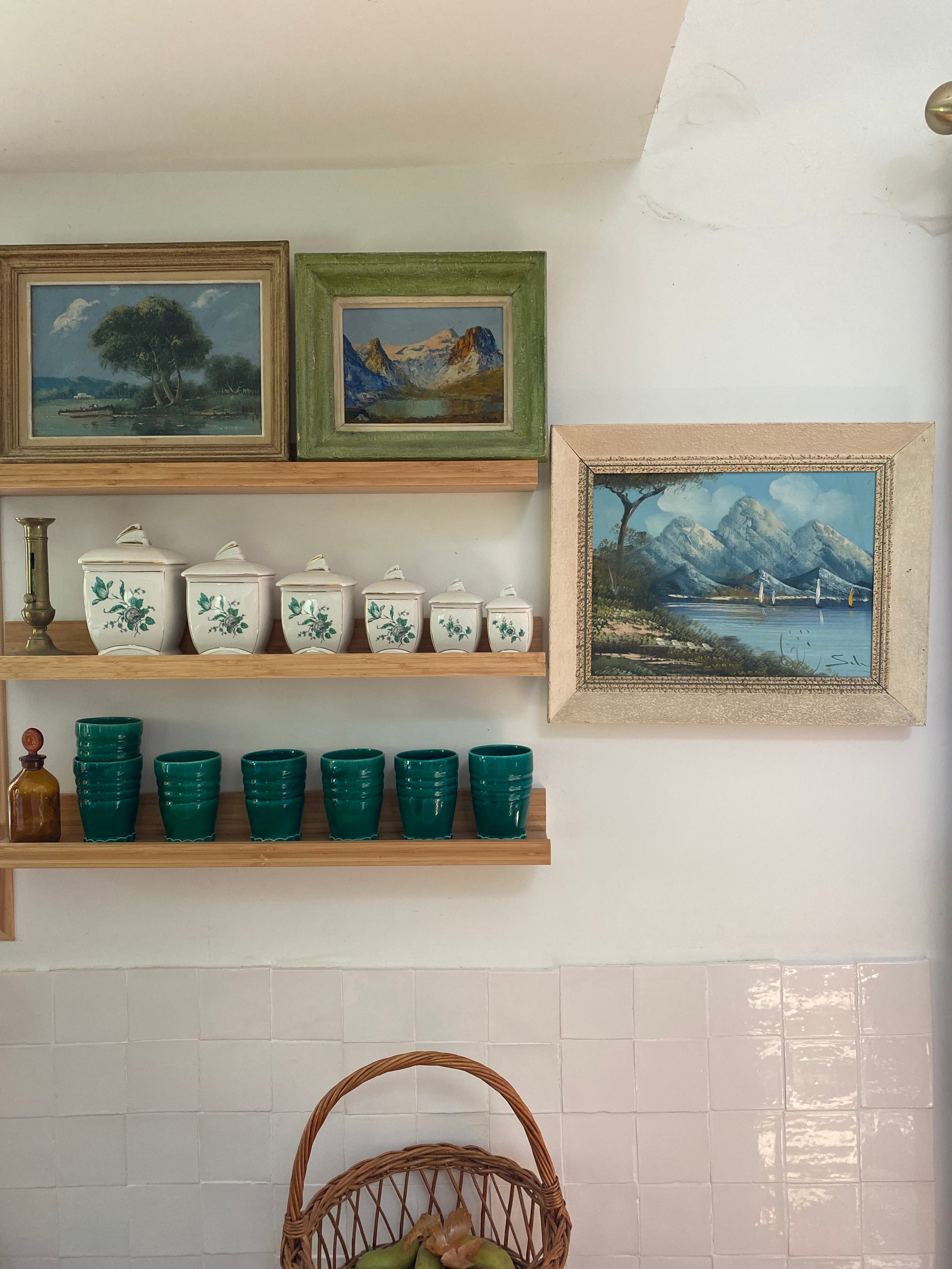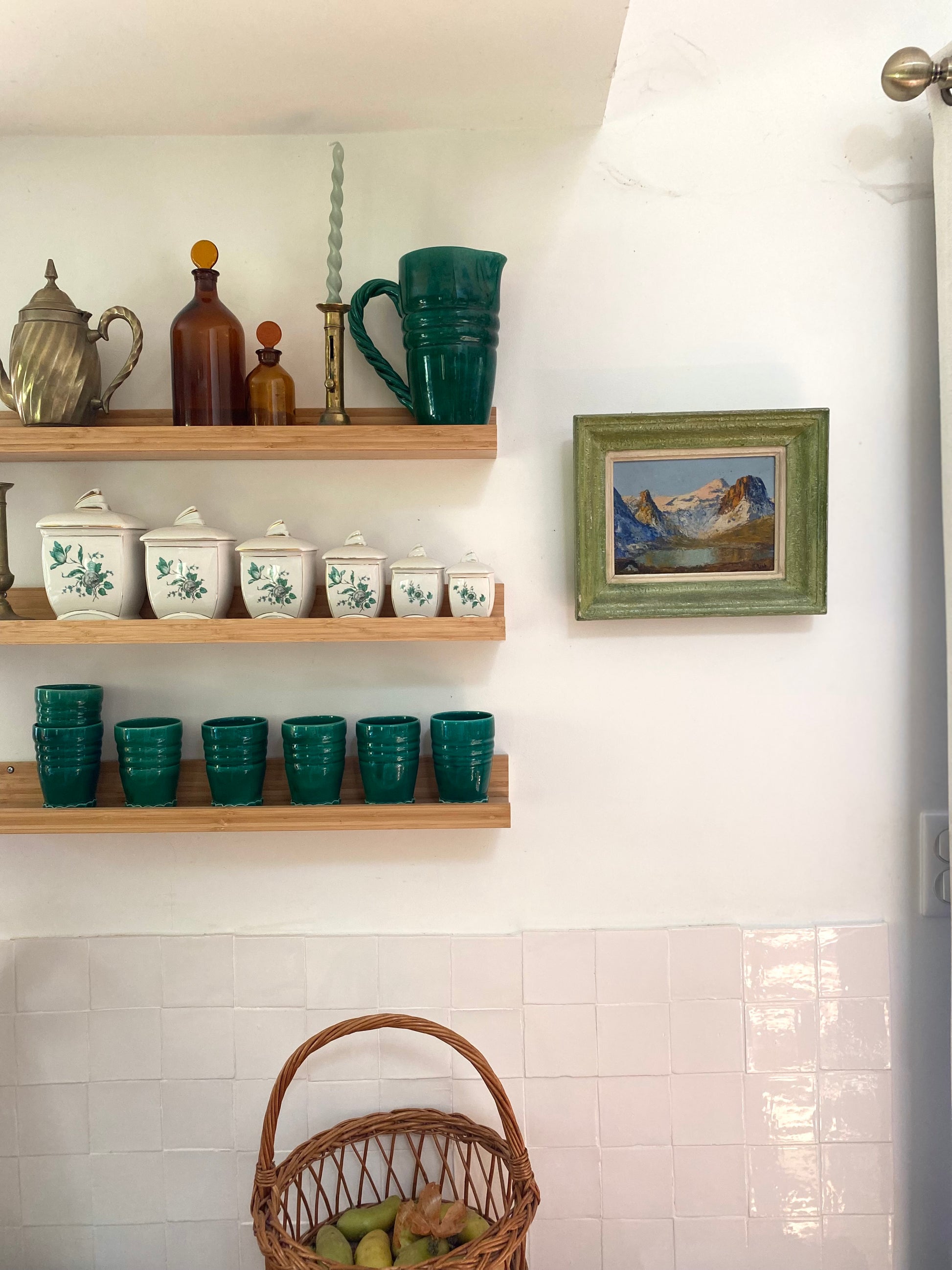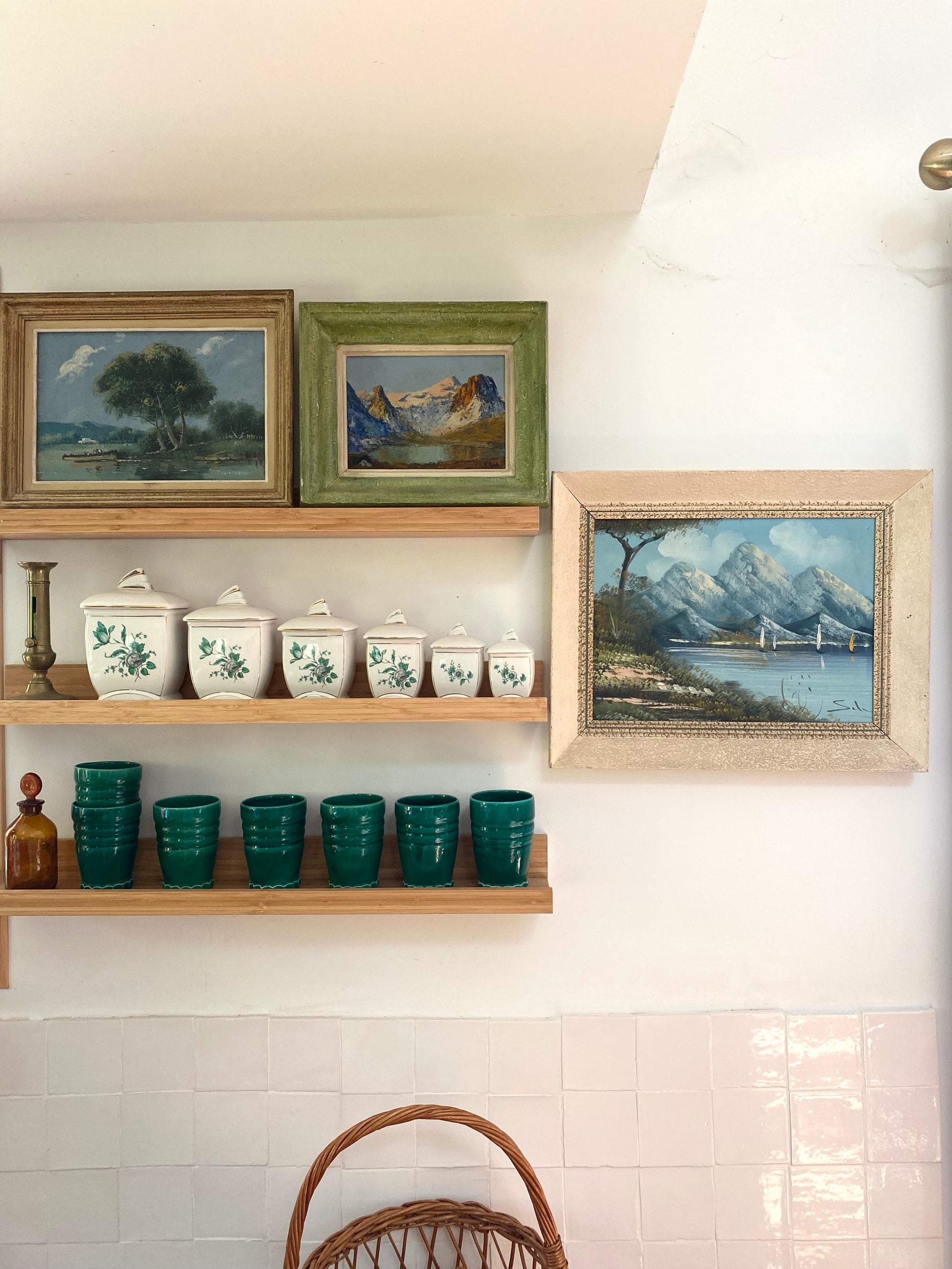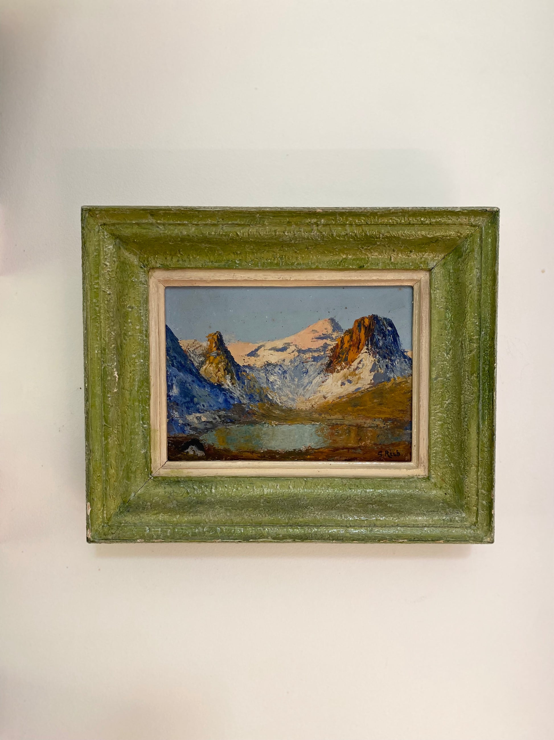Ce cadre est un modèle typique des années 1940-1950, conçu en bois et stuc (un enduit moulé) avec un profil en "pente" qui apporte de la profondeur à la vue alpine. Sa particularité réside dans sa patine vert lichen d'origine, un choix chromatique audacieux qui rappelle la végétation de montagne et les reflets du lac. Il possède une Marie-Louise (le liseré intérieur crème) qui sert à isoler la peinture et à faire ressortir la lumière du ciel. Conservé dans son "jus", ce cadre n'est pas qu'un simple support : il est indissociable de l'œuvre et confirme son authenticité historique. Sa texture granuleuse imitant la roche et sa couleur organique en font un objet de décoration très actuel, idéal pour un esprit "chalet vintage".