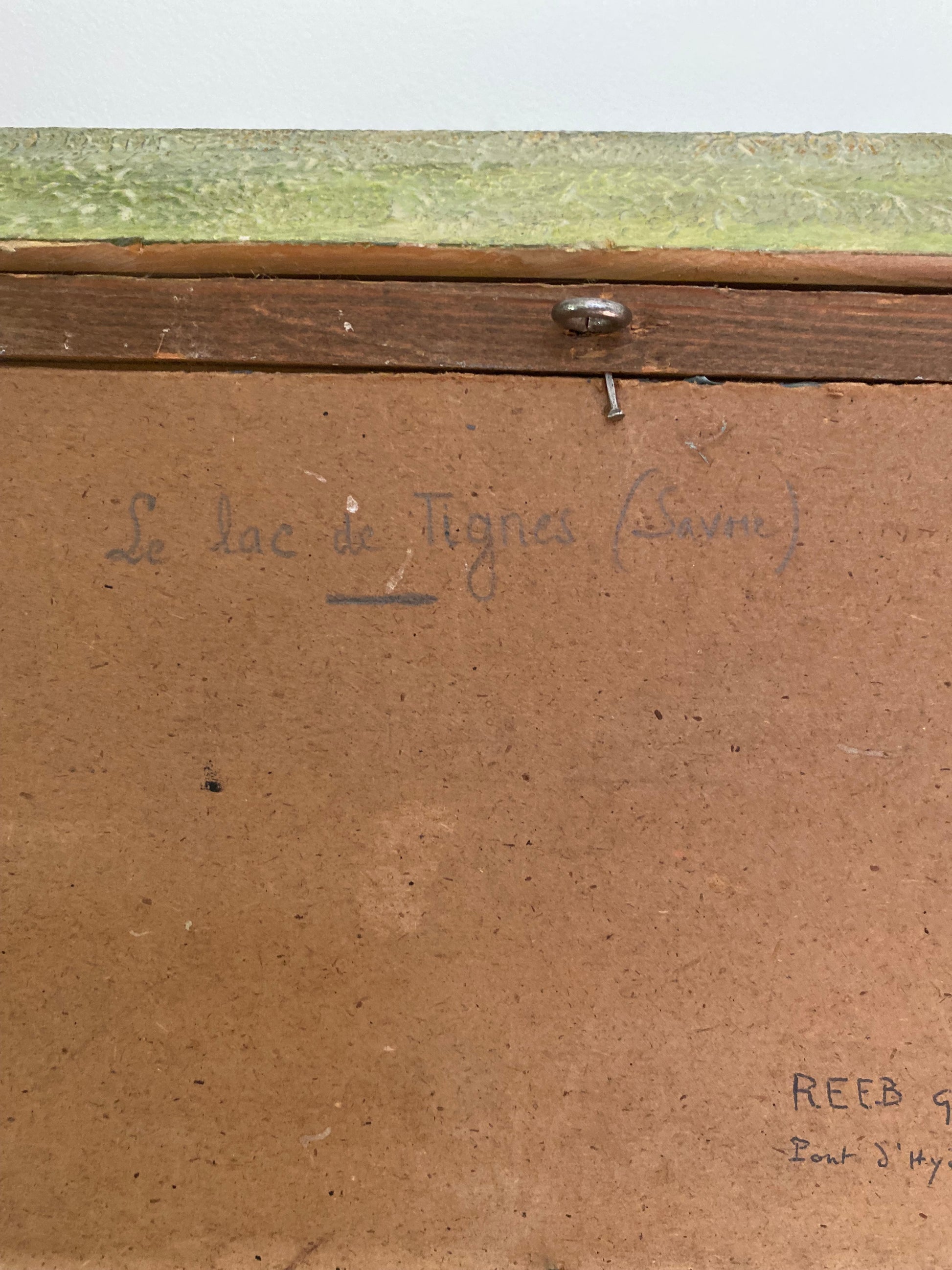 Ravissante huile sur panneau représentant le Lac de Tignes (Savoie), réalisée par l'artiste peintre savoyard Georges REEB (basé à Bissy/Chambéry au milieu du XXe siècle).