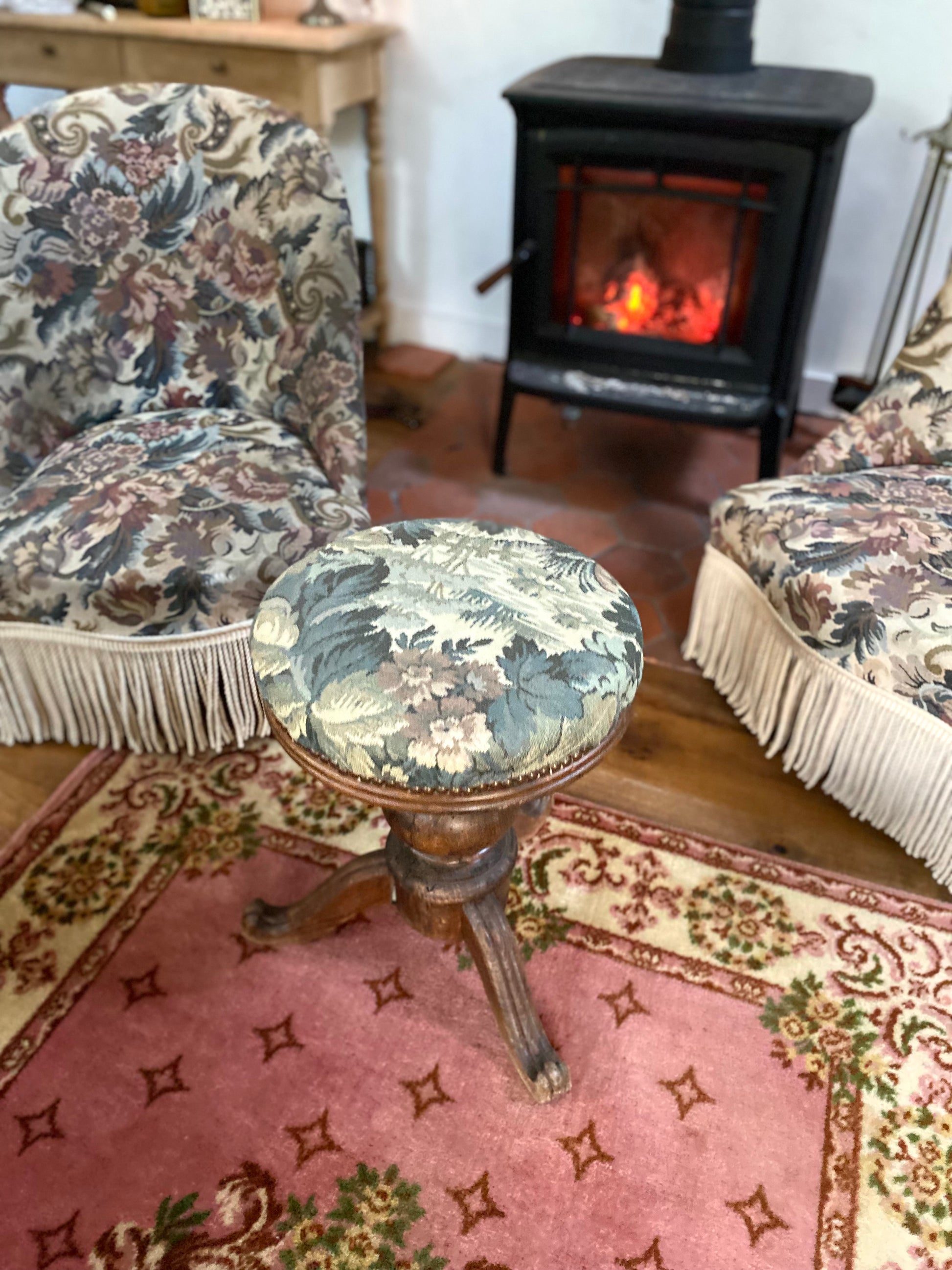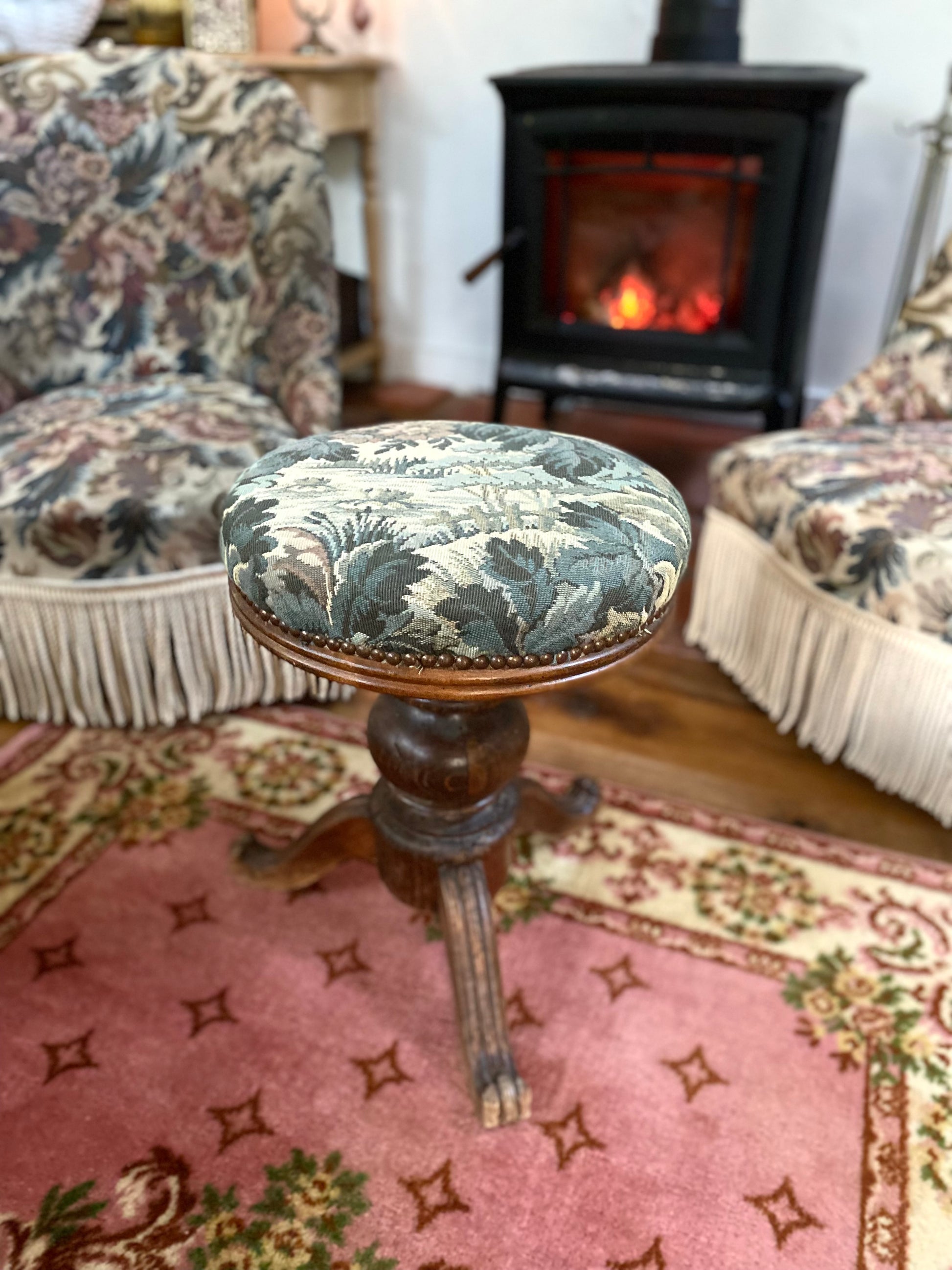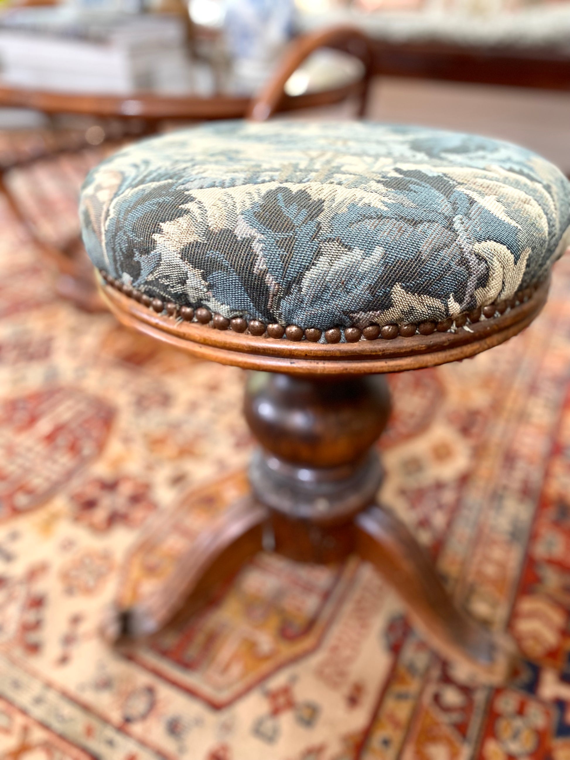 Tabouret de piano ancien en noyer sculpté de qualité victorienne, avec un siège circulaire pivotant à hauteur ajustable rembourré en tissu d'origine au-dessus d'une colonne en noyer massif sculptée, reposant sur trois pieds en noyer massif sculptés.