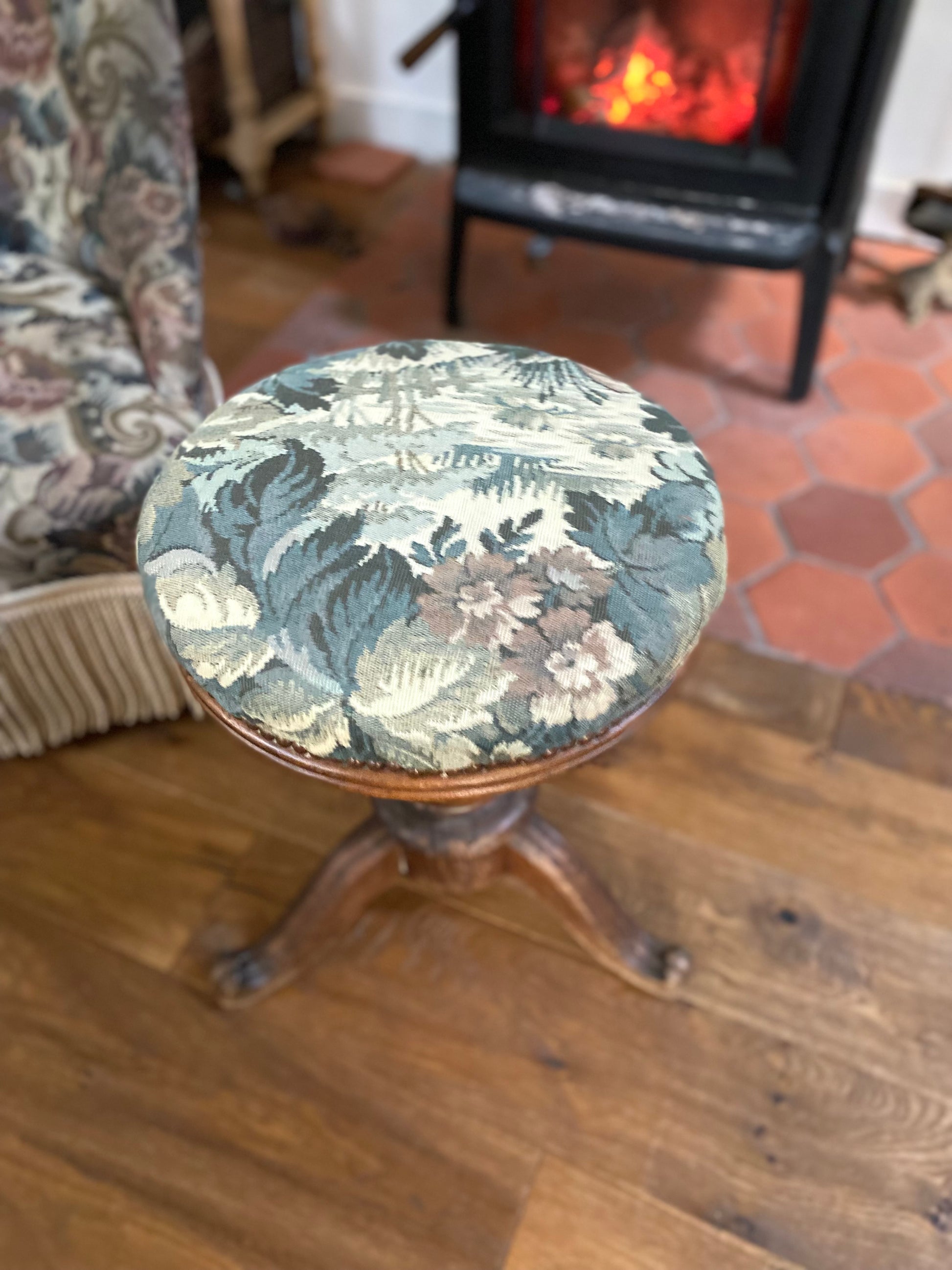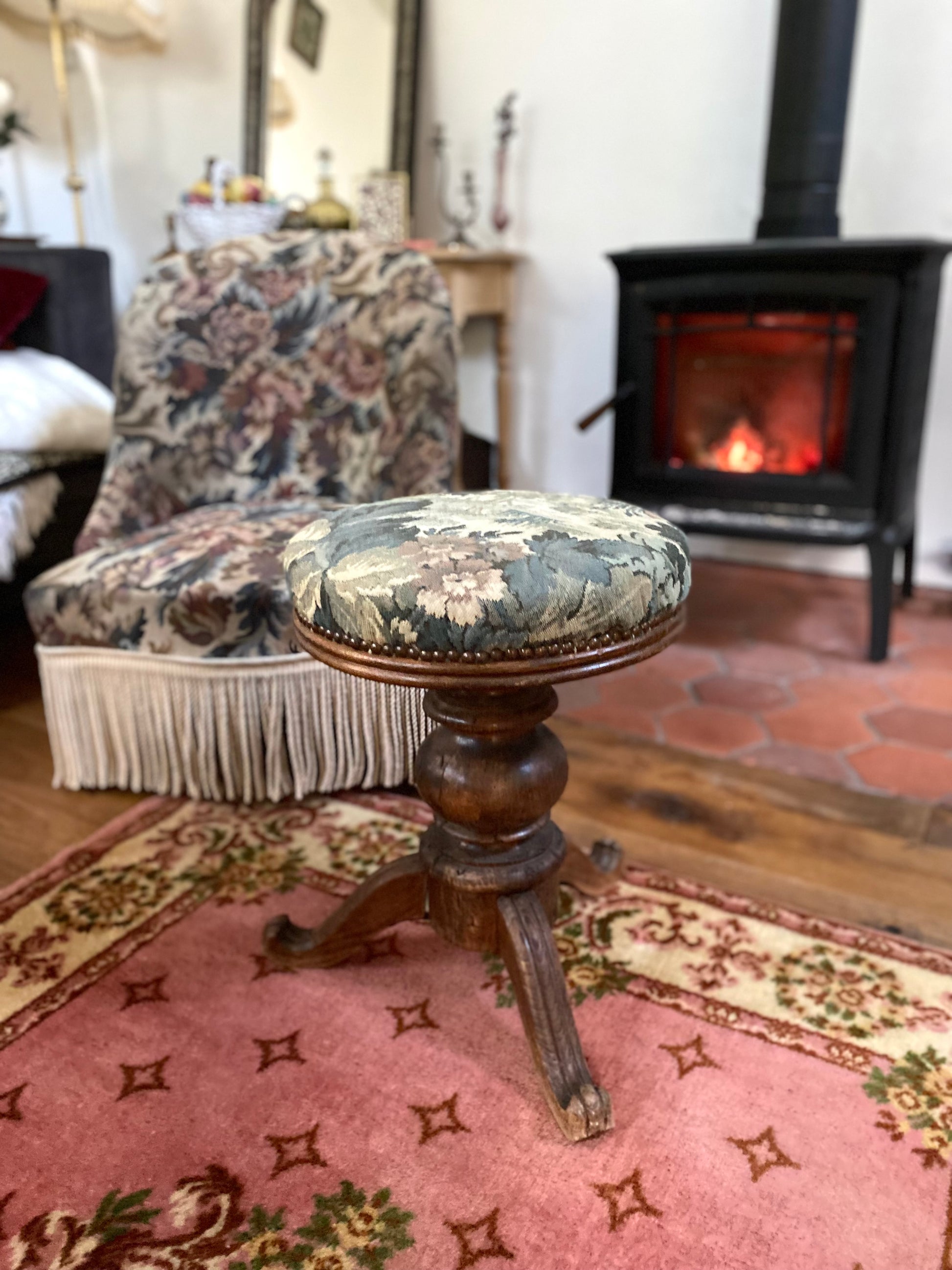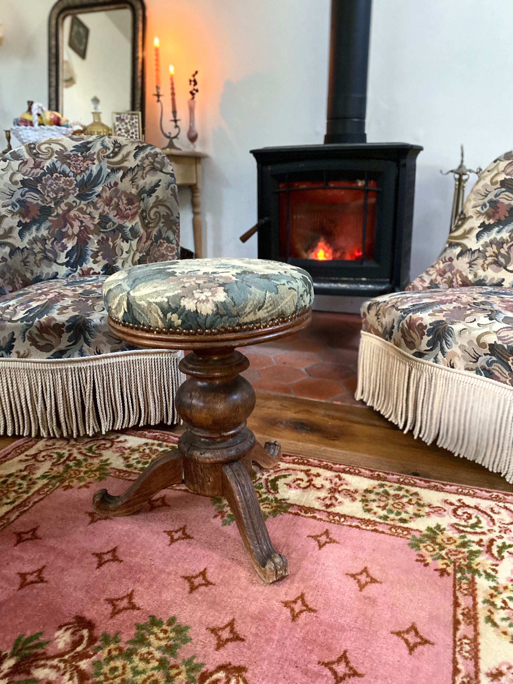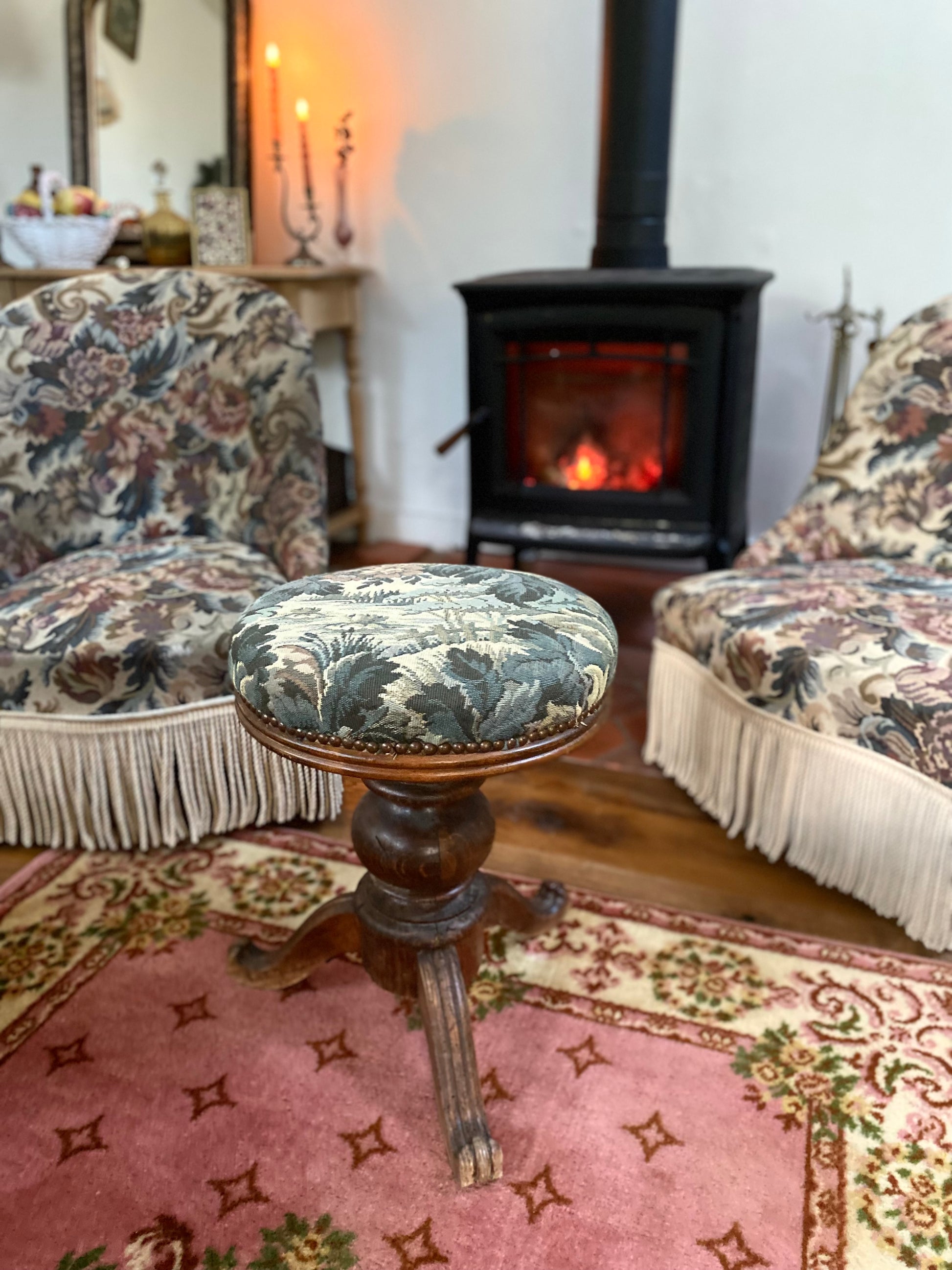 Tabouret de piano ancien en noyer sculpté de qualité victorienne, avec un siège circulaire pivotant à hauteur ajustable rembourré en tissu d'origine au-dessus d'une colonne en noyer massif sculptée, reposant sur trois pieds en noyer massif sculptés.